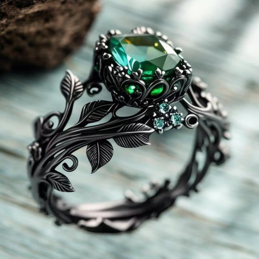 925 SS Black Rhodium Emerald Leaf Motif Ring