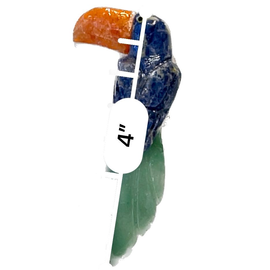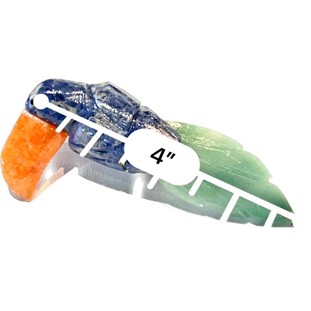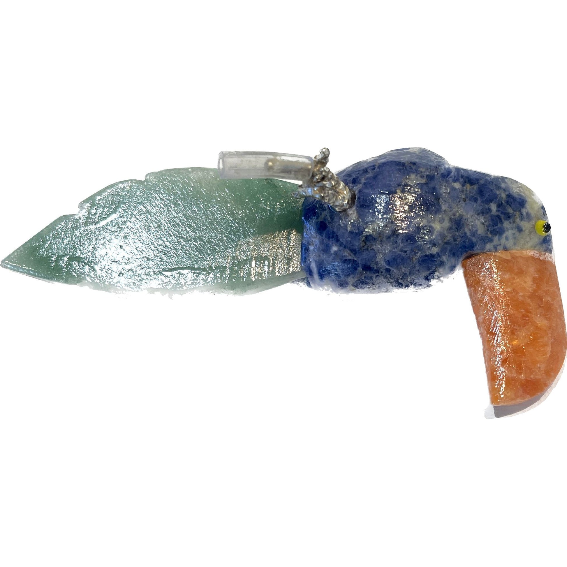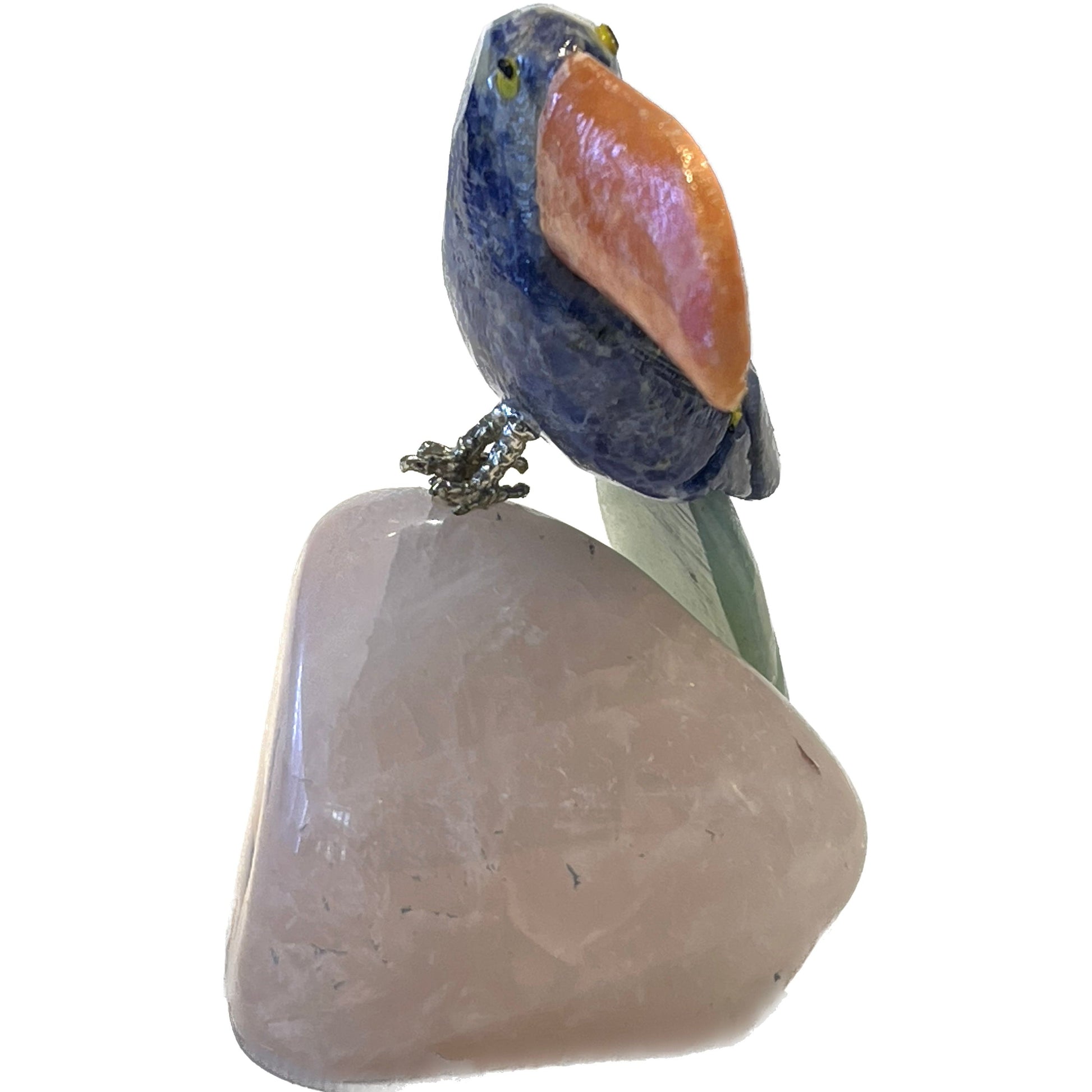 4 Inch Toco Toucan masterpiece made of Soadlite body, Green Aventurine Tail, and Carnilian beak mounted on Rose Quartz base.