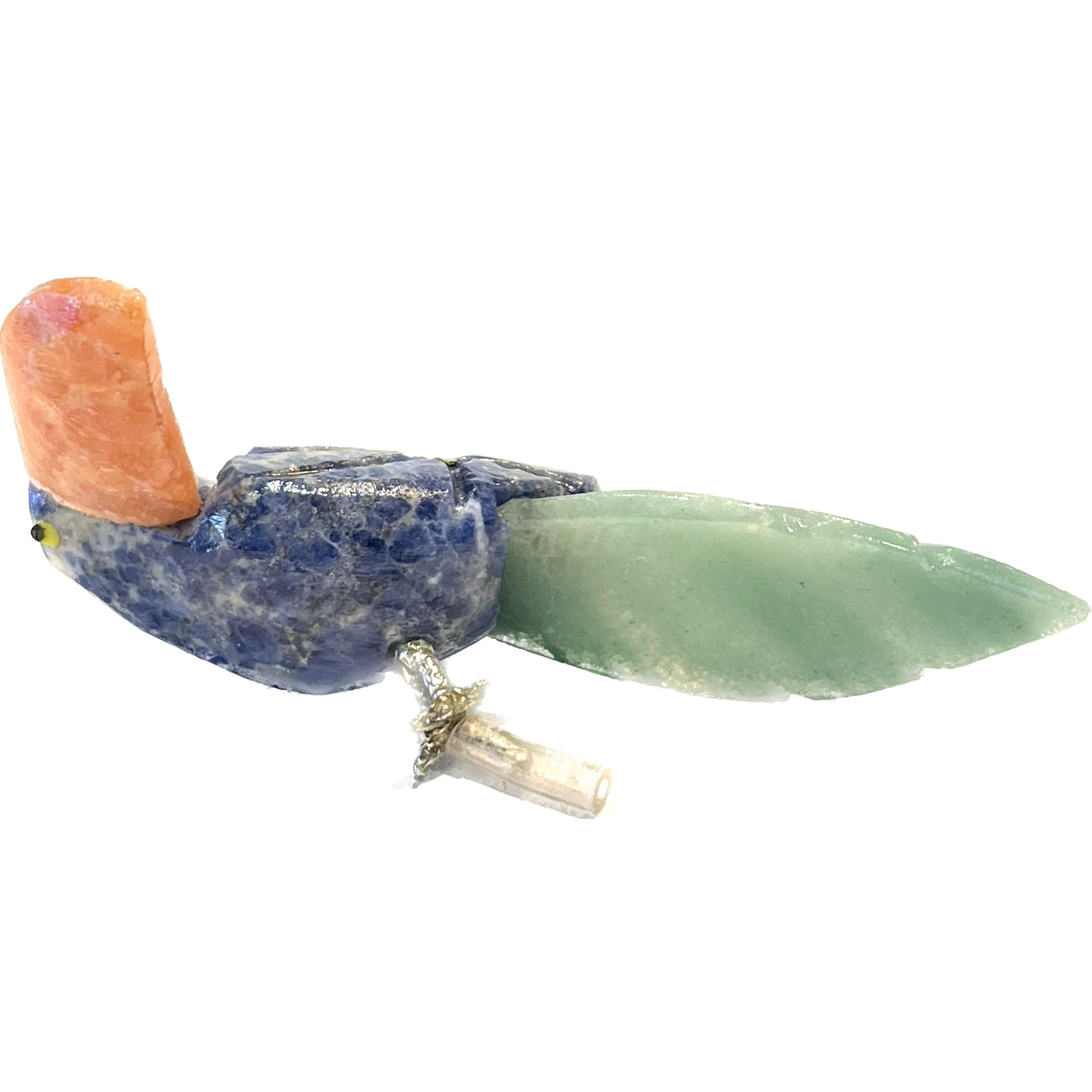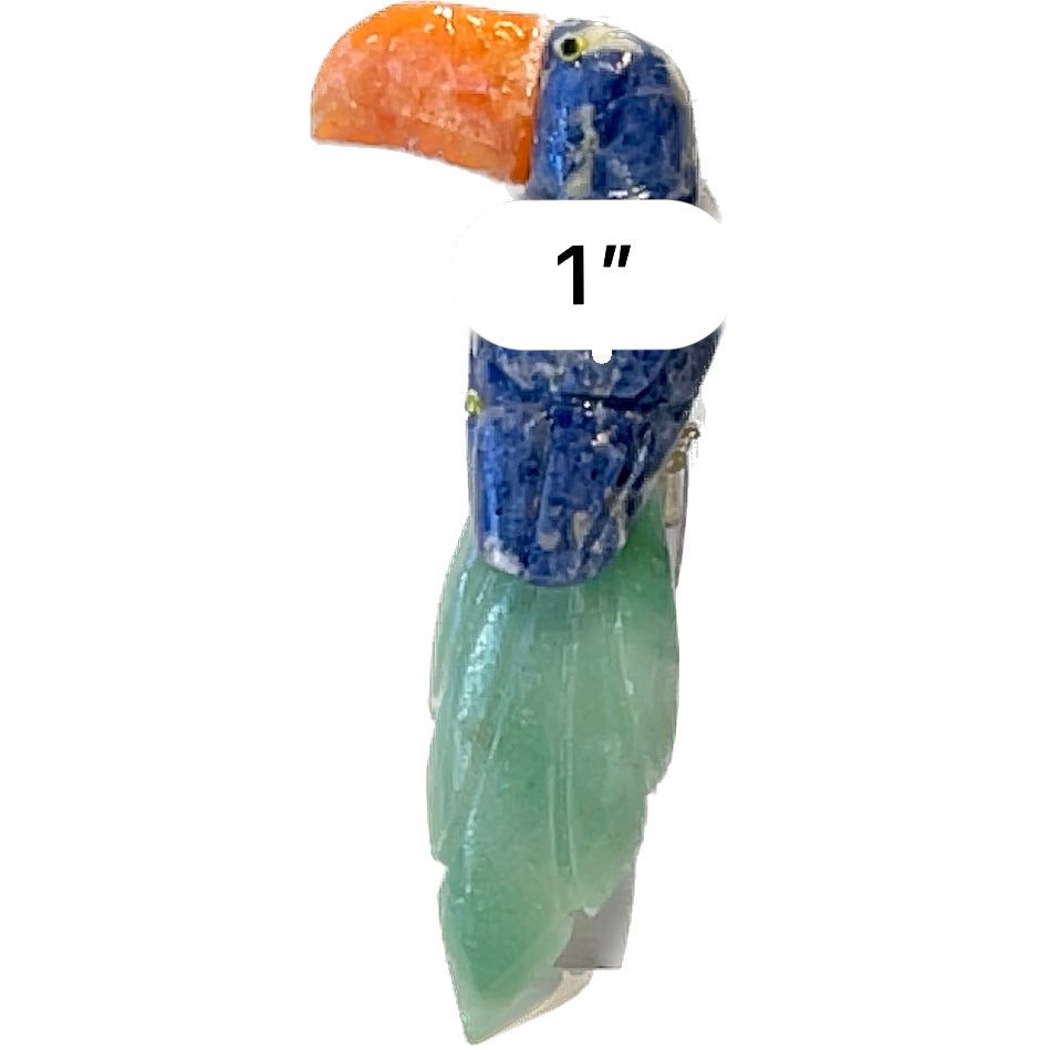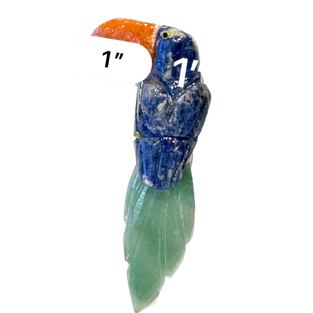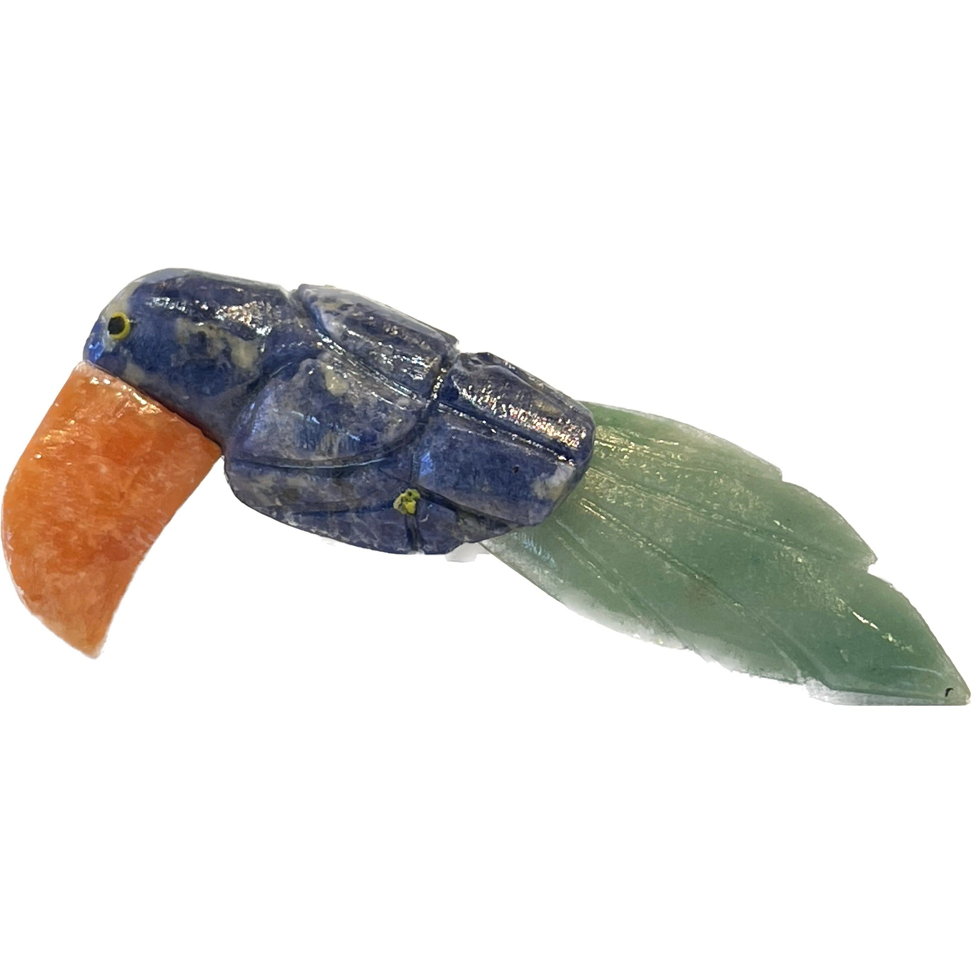 4 Inch Toco Toucan masterpiece made of Soadlite body, Green Aventurine Tail, and Carnilian beak mounted on Rose Quartz base.