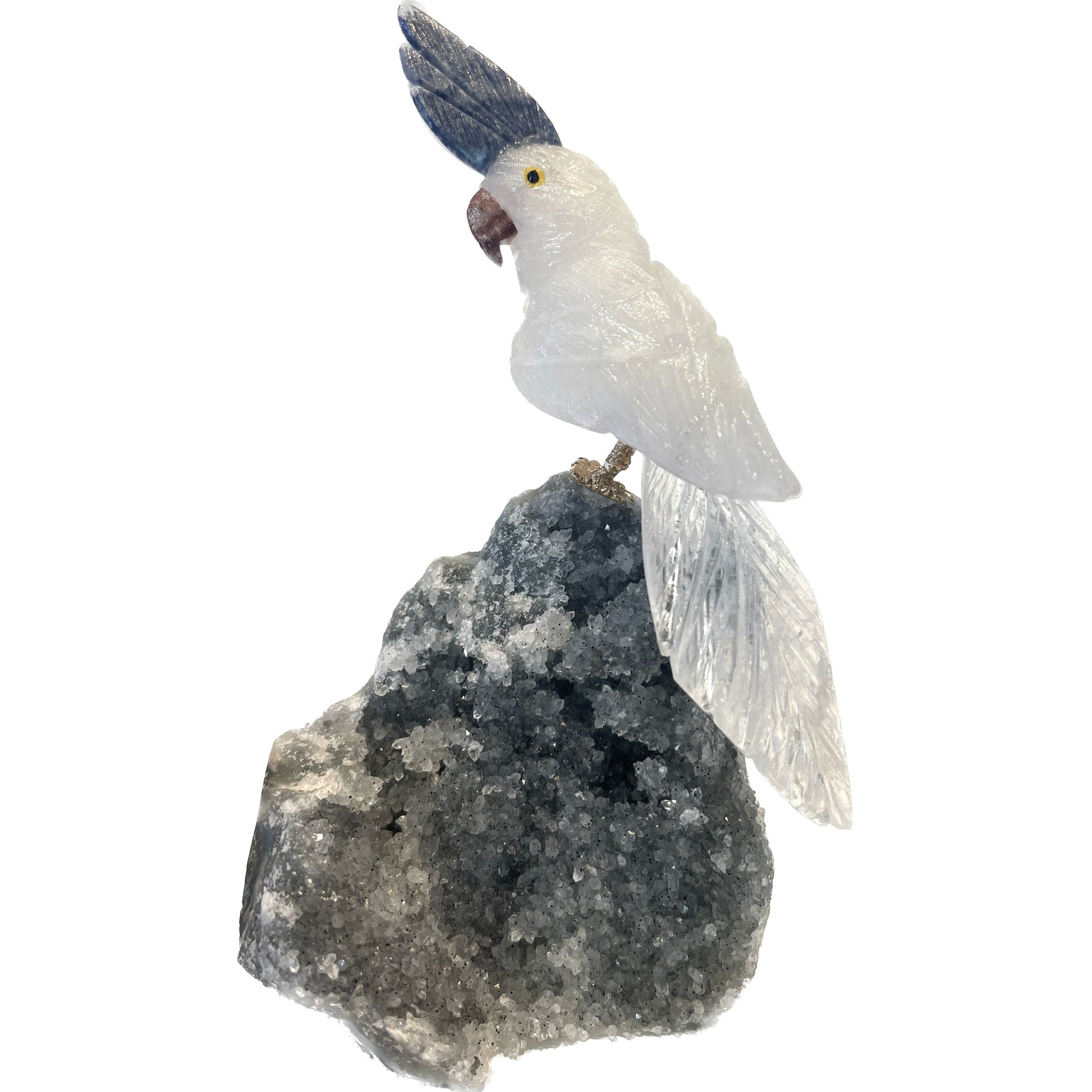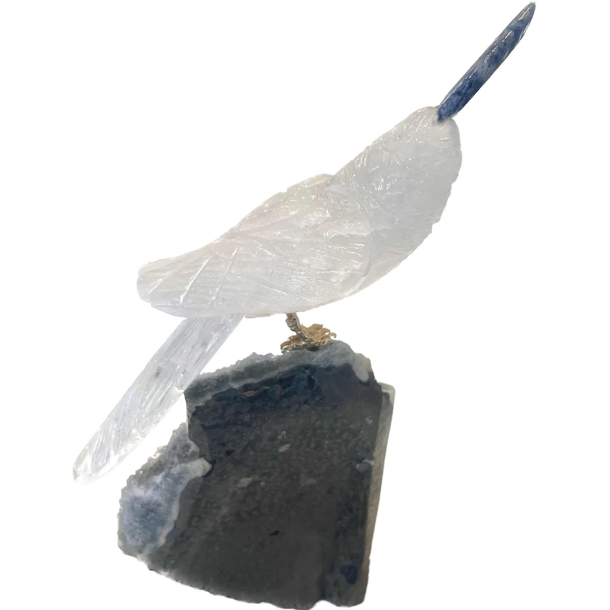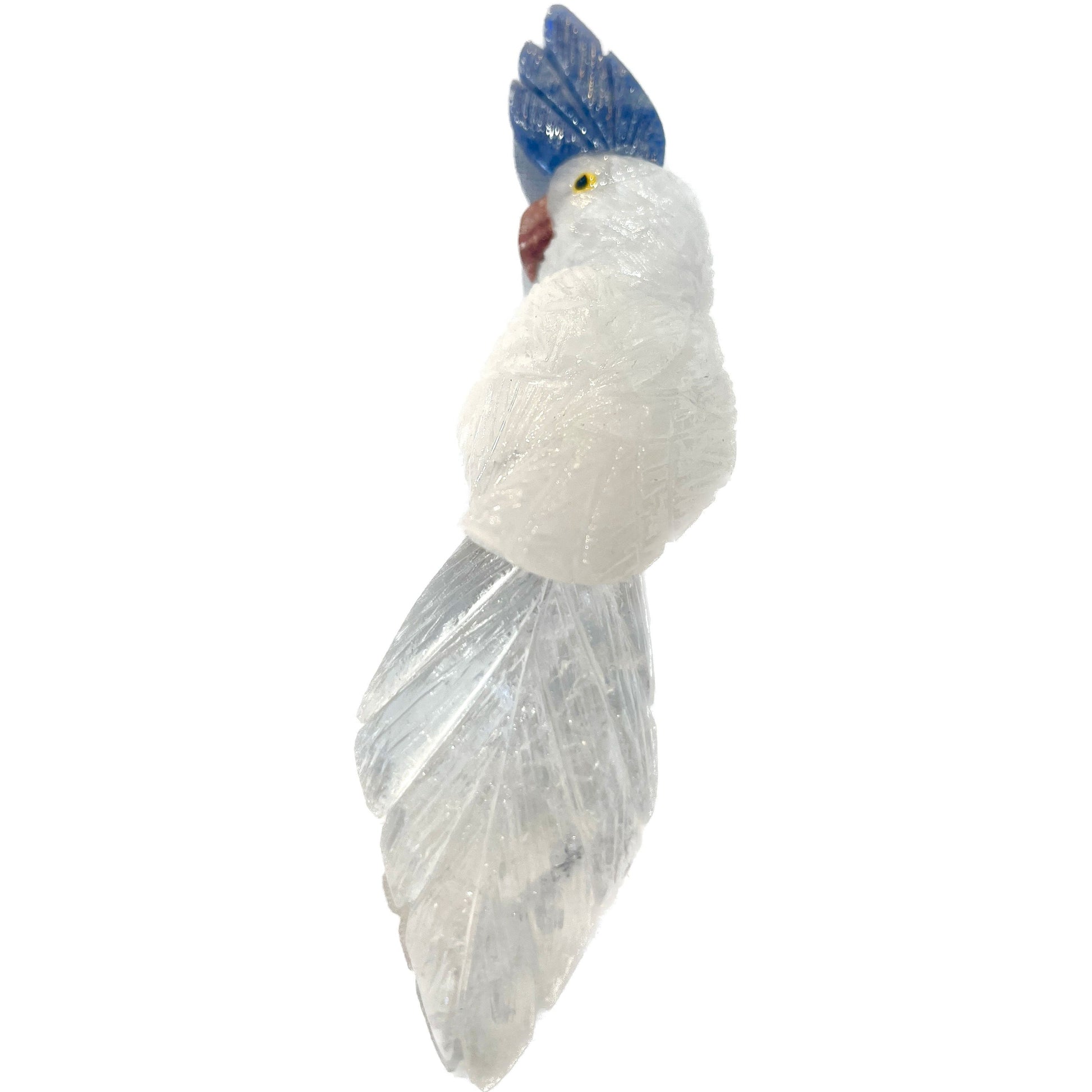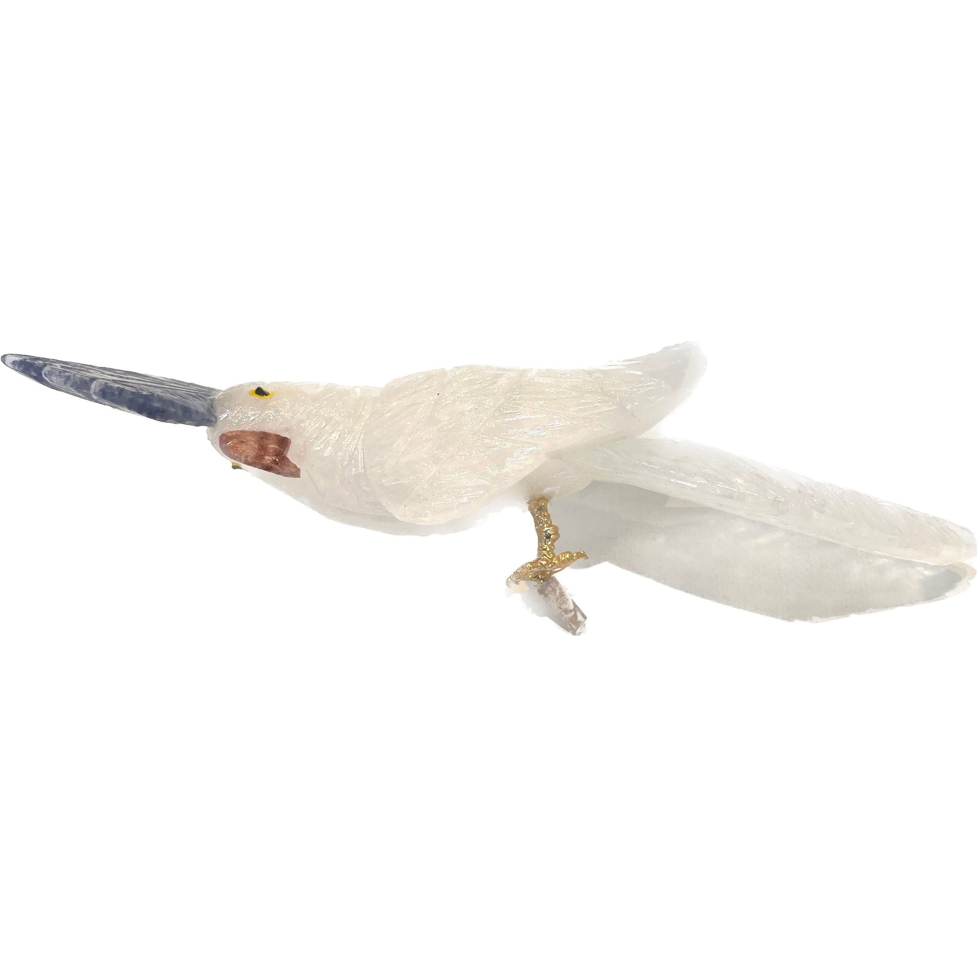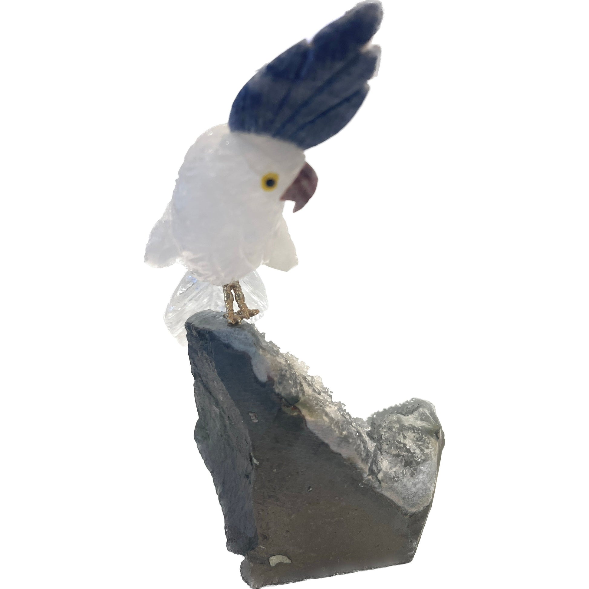 6 1/2 Inch Budgerigar Parrot masterpiece made of Clear Quartz body & Tails, Soadlite Crown, and Brown Jasper beak mounted on Gray Amethyst base.