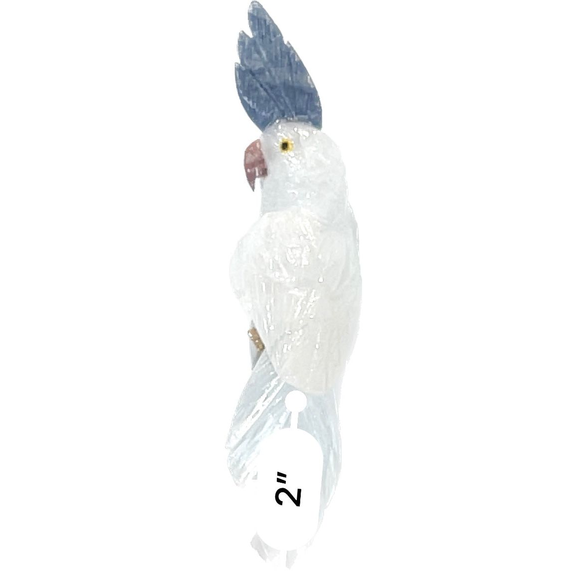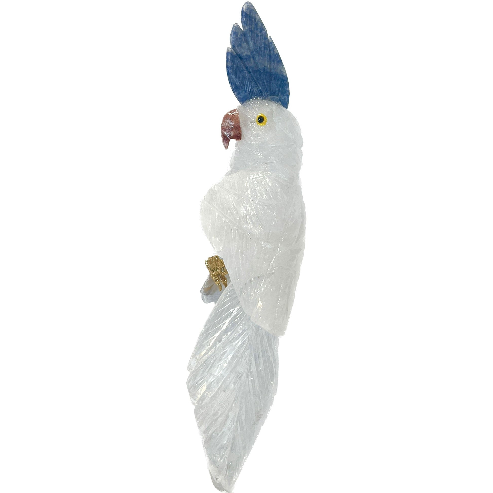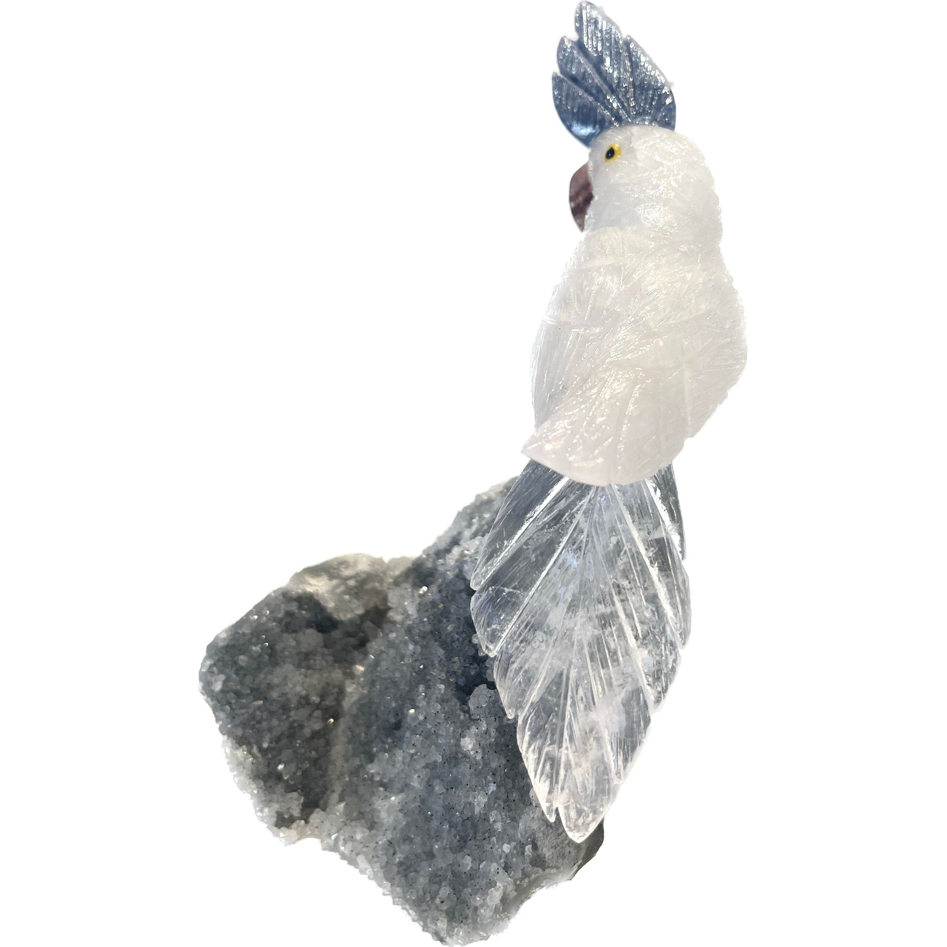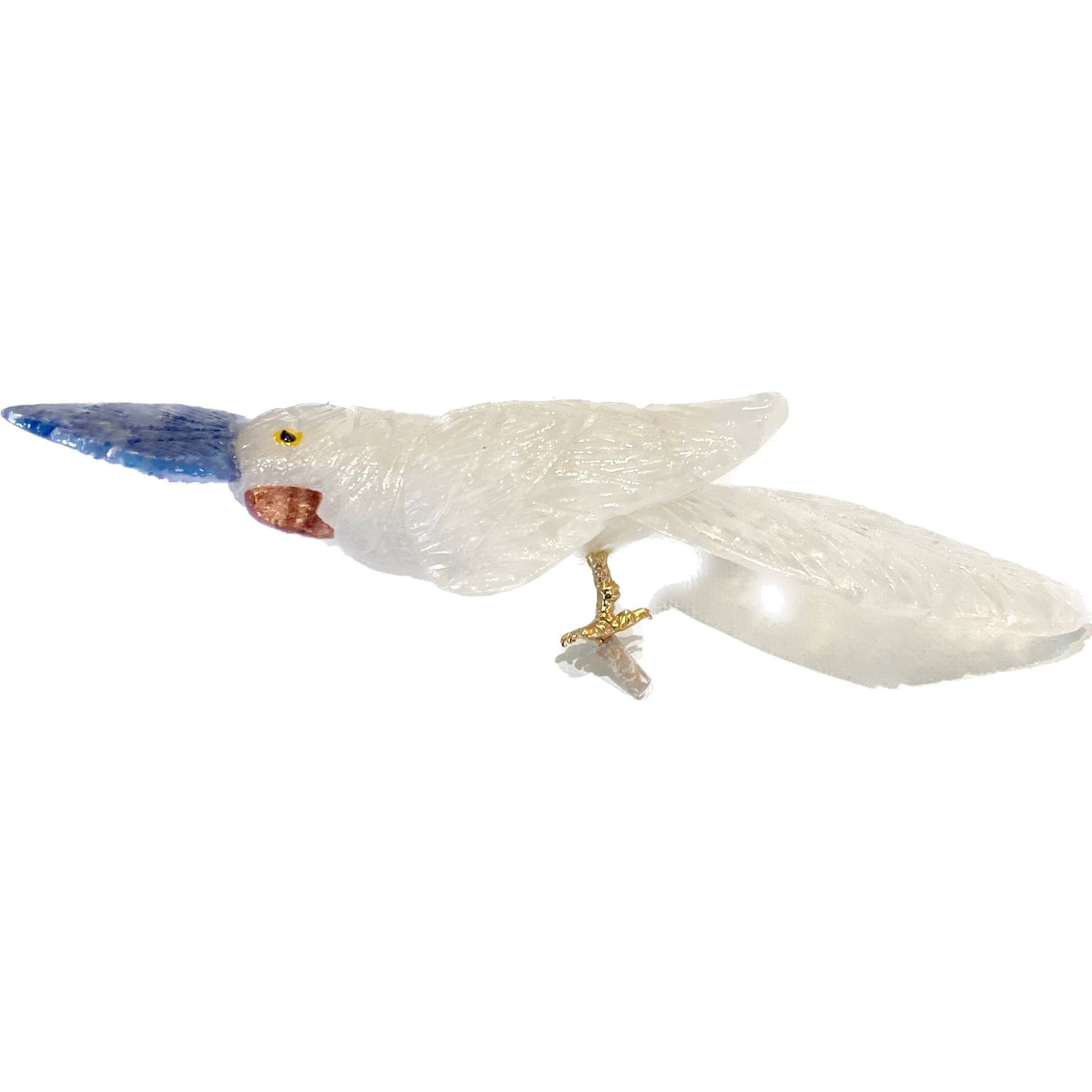 6 1/2 Inch Budgerigar Parrot masterpiece made of Clear Quartz body & Tails, Soadlite Crown, and Brown Jasper beak mounted on Gray Amethyst base.