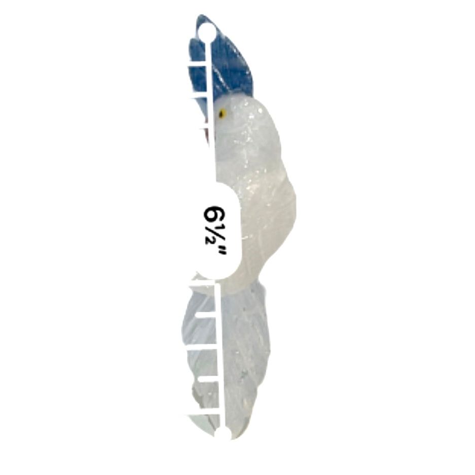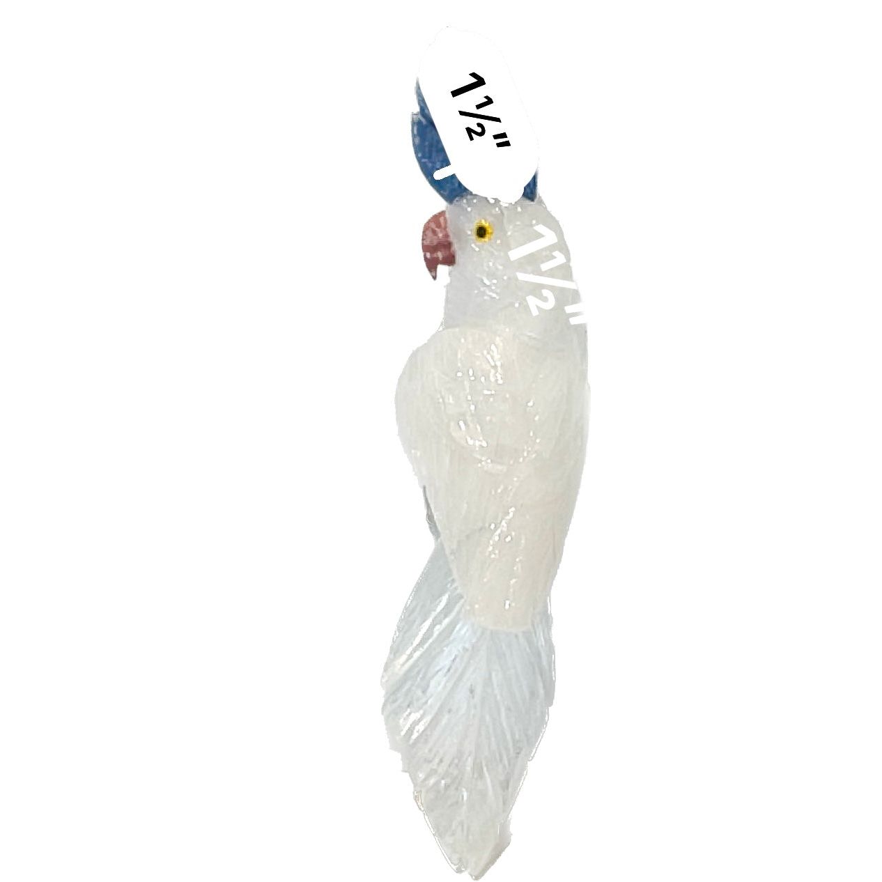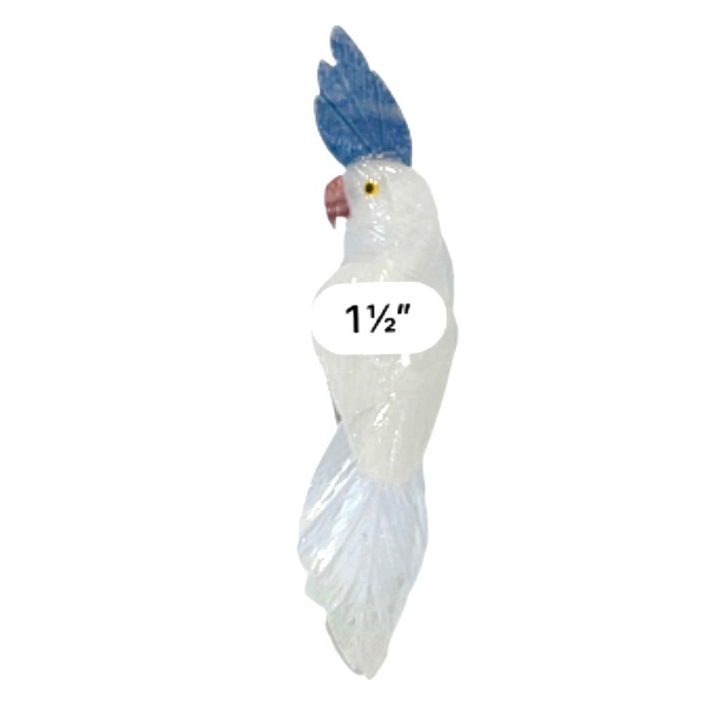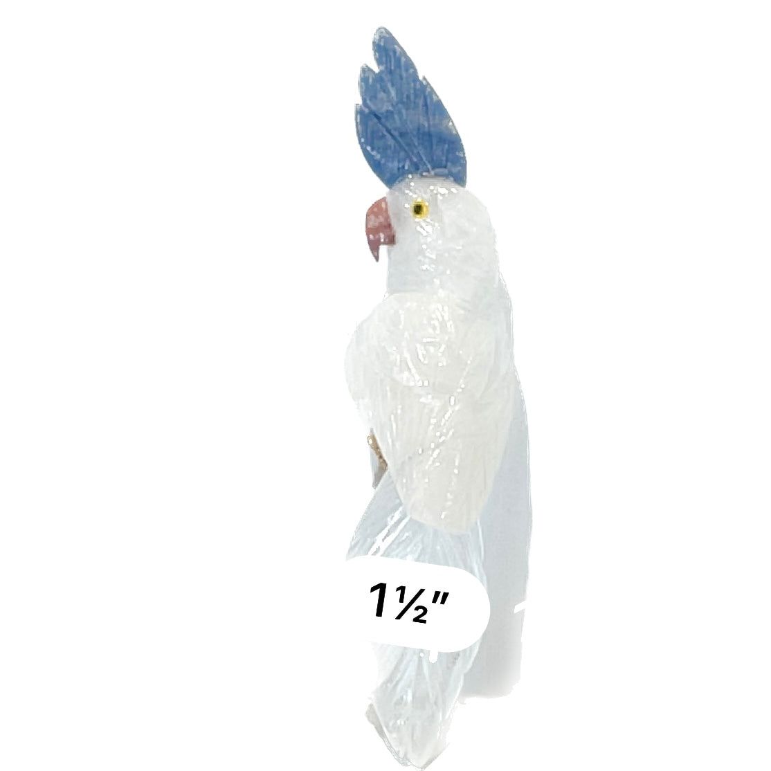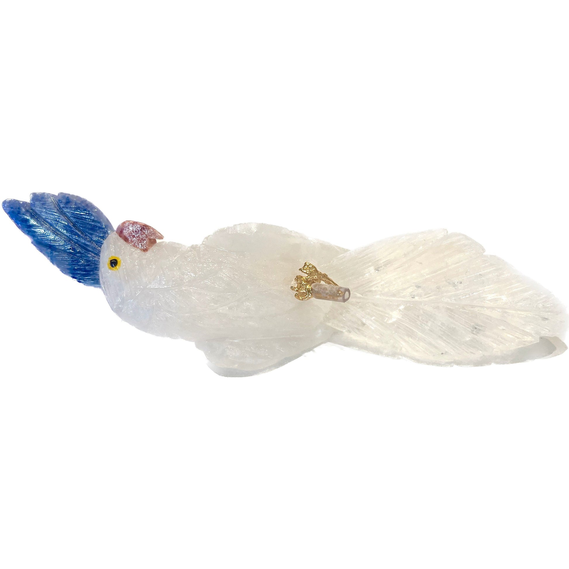 6 1/2 Inch Budgerigar Parrot masterpiece made of Clear Quartz body & Tails, Soadlite Crown, and Brown Jasper beak mounted on Gray Amethyst base.