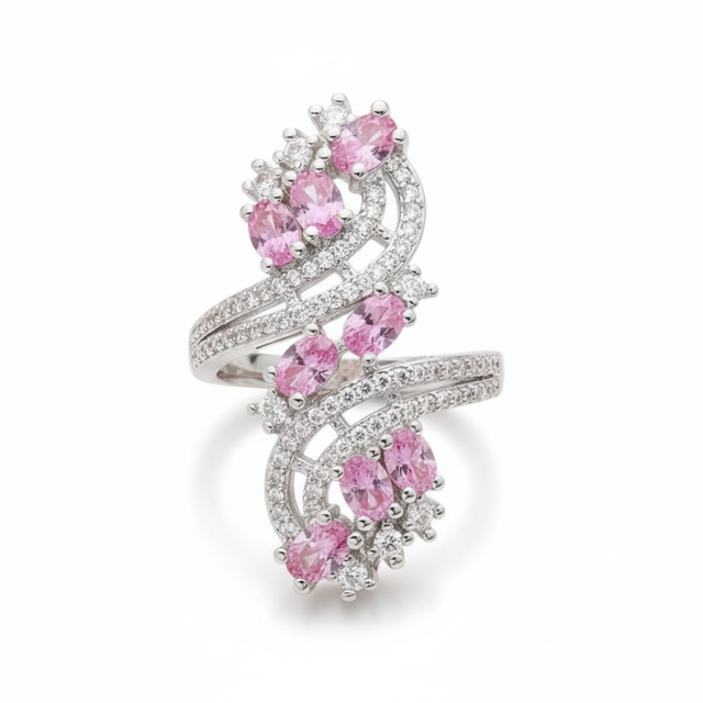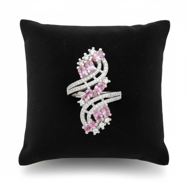 An extraordinary display of radiant pink sapphire gemstones, elegantly framed by shimmering pavé accents and set in polished sterling silver. The intricate openwork design delivers exceptional brilliance and refined glamour, making this ring a statement of true luxury and sophistication.